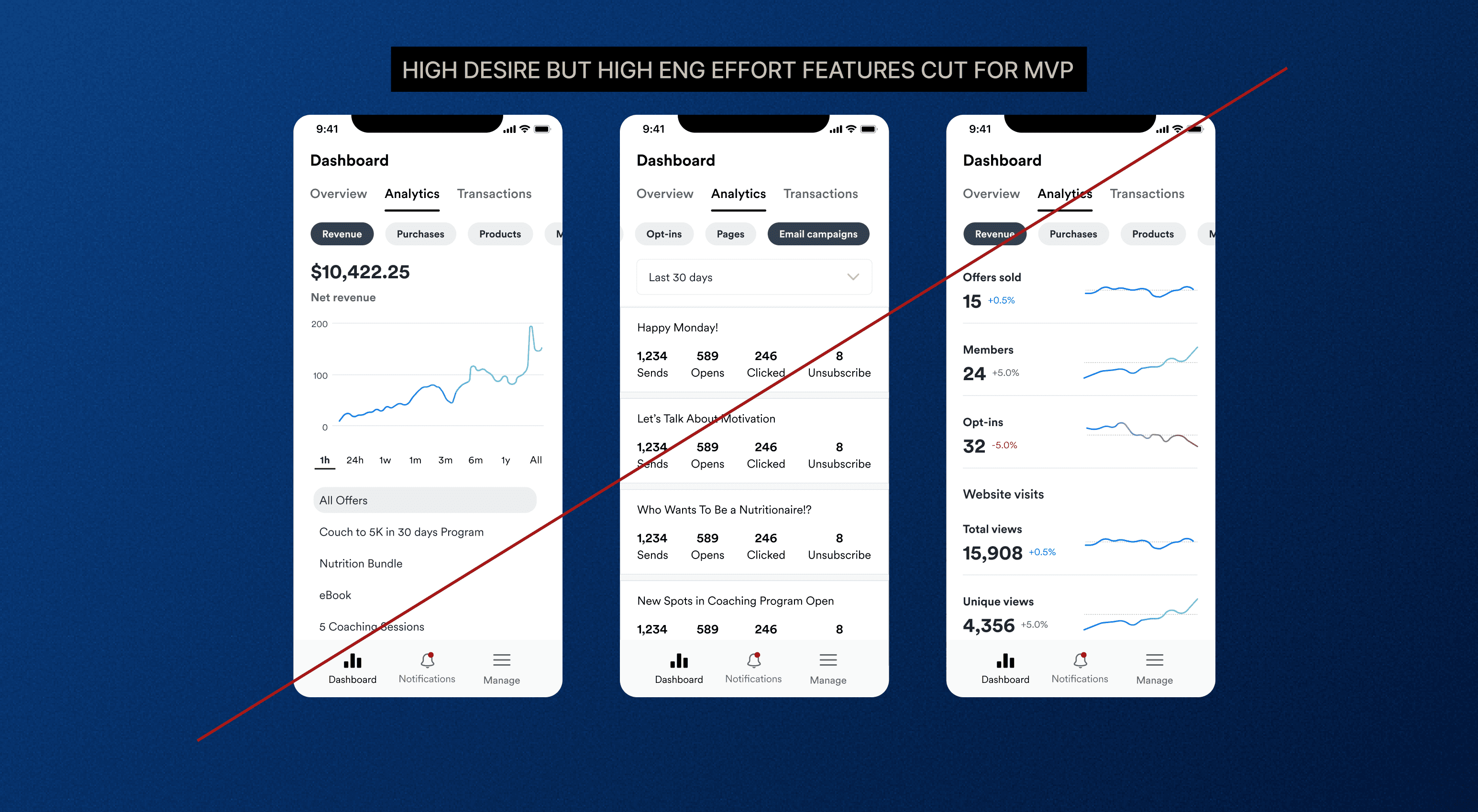 Advanced analytics, CRM tools, and marketing stats were pushed to V2 due to the data being more difficult to access out of the box and a heavier front end required to represent the data appropriately.